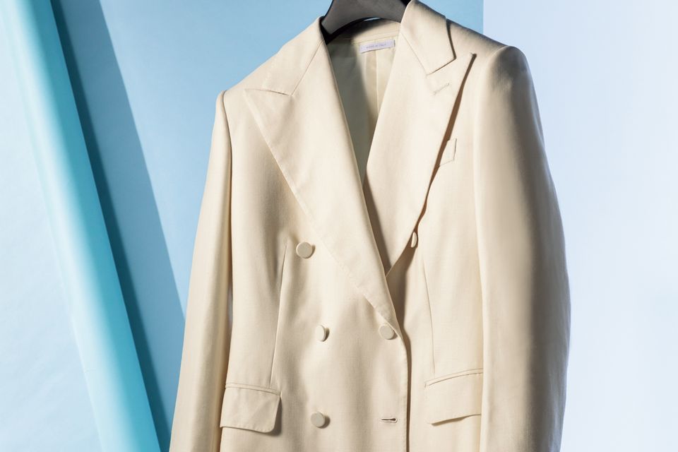 ウール50+シルク30+リネン20パーセントの混紡素材で、ウールのしっとり感とシルクの光沢、リネンのシャリ感が同居することにより、艶やかかつ軽やかな仕上がりに。この記事の掲載号