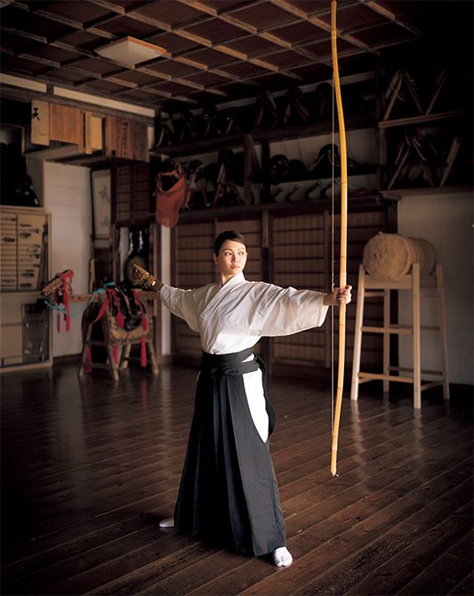 矢を射った直後の二階堂さん。小笠原流弓術の重要な教え「残心」は、動作を行ったあとに数秒間、心を残すこと。その間が、美しい姿勢となって表れる。弓道場には、室町時代から江戸時代までの鞍をはじめ、さまざまな道具が並び、今なお現役で使用されている。