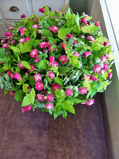 マーブル模様の八重咲きアスター‘ココットマーブルレッド’のかわいらしさをアピールしたくて、同じ色合いのベル型のクレマチス‘天使の首飾り’だけを合わせてシンプルなアレンジに。マウンテンミントとルテウスをたっぷり加えてフレッシュ感のある仕上がりにしました。記事を読む>>