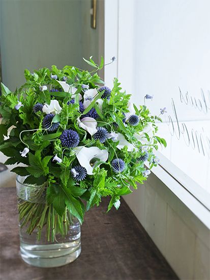 白いカラーとごく淡い青紫のクレマチス、その中にボール状のルリタマアザミ‘ベッチーズブルー’を加えると、発色のよいメタリックブルーがブーケの印象をより強めます。カラーは‘サッポロ’、クレマチスは‘ソシアリス’。ゼラニウム、スペアミント、キイチゴ‘ベビーハンズ’をたっぷり加えてナチュラルに。結婚記念日にご主人から奥さまへの贈り花です。記事を読む>>