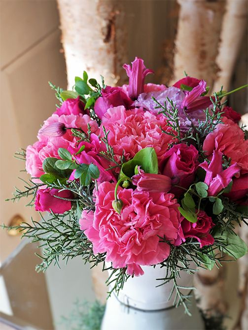 鮮やかで深みのある濃いピンクのカーネーション‘フェミニンミナミ’は、秋冬の贈り花にぴったり。バラ‘ドラマティックレイン’、クレマチス‘天使の首飾り’、リシアンサス‘セレブリッチラベンダー’を合わせ、コニファーの‘ブルーアイス’をあしらったアレンジ。お友達の誕生日を祝う贈り花です。記事を読む>>
