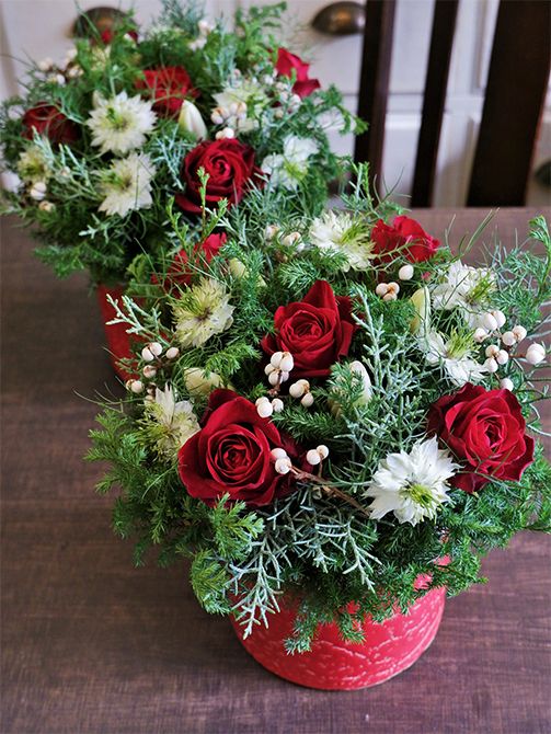 クリスマスらしさがひと目で伝わる赤×緑色のアレンジ。コニファーの‘ブルーアイス’とサツマスギのベースにつややかな深紅のバラ‘ヴァニティルージュ+’に、ニゲラ‘ミスジーキル’、チューリップ‘ダーウィースノー’を挿し、ナンキンハゼの実を加えて。記事を読む>>