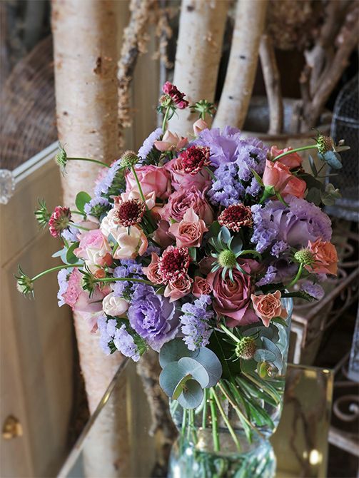 透明感のある落ち着いたブルーのスターチス‘シースルーブルー’は和歌山県の花農家・宮本一輝さん生産。ニュアンスのあるピンク系のバラのすき間を埋めるように加えました。バラは‘テナチュール’、‘乙女のわがまま’、‘ナギサブラウン’、‘ローズメイ’の4種。ほかにリシアンサスやスカビオサなどを利用。記事を読む>>