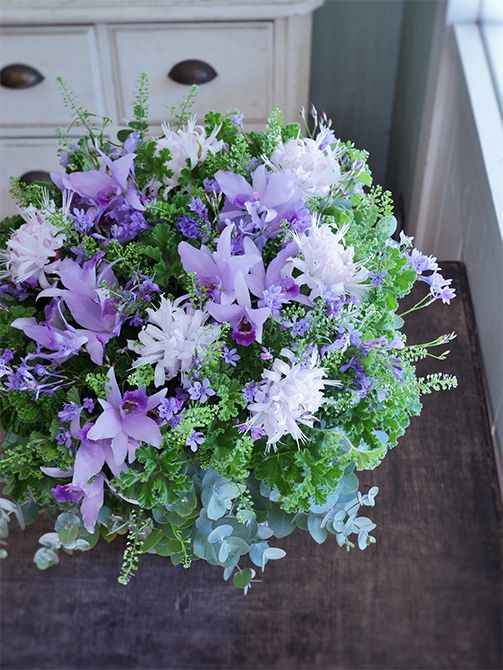 透明感のある薄紫色のカトレア‘アメシステラ’とごく淡いピンクのダイヤモンドリリーとの組み合わせで気品のあるブーケに。著名なアーティストさんに、活動50周年と文化功労者選出のお祝いに広島のテレビ局からの贈り花です。ライペロージア、タラスピオファリム、ビターチョコゼラニウムをあしらってナチュラルでさわやかな雰囲気に仕上げました。記事を読む>>