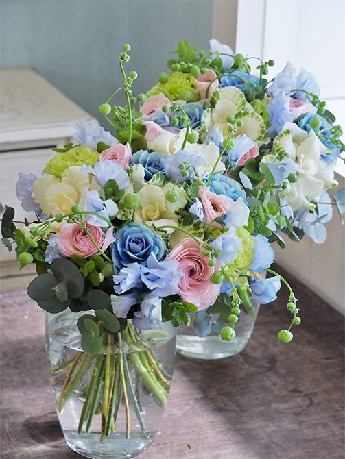 濃い水色の花がハボタン‘碧てまり’。一瞬、水色のバラのように見えませんか?お正月に飾る花のオーダーを受け、早春を感じさせる優しいパステルカラーのブーケを制作しました。染めのスイートピー‘そらいろ’、ラナンキュラスの‘オルレアン’と‘ポントワーズ’、リシアンサス‘アンバーダブルモヒート’を束ね、シレネ‘グリーンベル’やアップルミント、ユーカリでナチュラルに仕上げました。記事を読む>>
