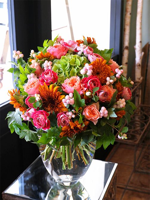 お部屋に飾る花をというオーダーに、バラ‘コーラルハート’と‘チアフル’に、ヒマワリを加え、華やかな秋色のブーケを制作しました。花と花の間に入れたシンフォリカルポス‘チャーミングファンタジー’がブーケにかわいらしさをもたらします。ほかに秋色アジサイ、‘ホワイトベレナ アンティーク’、キイチゴ‘いろは’などを使用。記事を読む>>