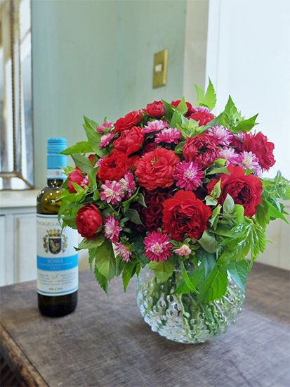 ブーケと一緒にワインを贈りたいというオーダーです。鮮やかな赤バラの‘唐紅’をバイカラーのアスター‘ココットマーブルレッド’と合わせてブーケに。よく冷やしたワインとともに夏の赤いブーケを楽しんで。ほかにケイトウやキイチゴなども加えています。記事を読む>>