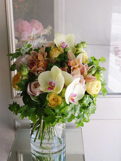 淡い黄色に濃いピンクのリップ。しかも、羽ばたいて今にも飛び立ちそうな蝶のような花形。ミディファレノプシス‘フラーズサンセット’のかわいらしさは誰をも魅了します。ほんのり茶色がかったシックな染めのシンビジウムと2種のバラを合わせて束ねました。たまご色のバラは蕾付きの‘カタリナ’、ピンクのバラは‘シフォンベール’。キイチゴ‘いろは’をたっぷりあしらい、エレガントでみずみずしい贈り花に。記事を読む>>
