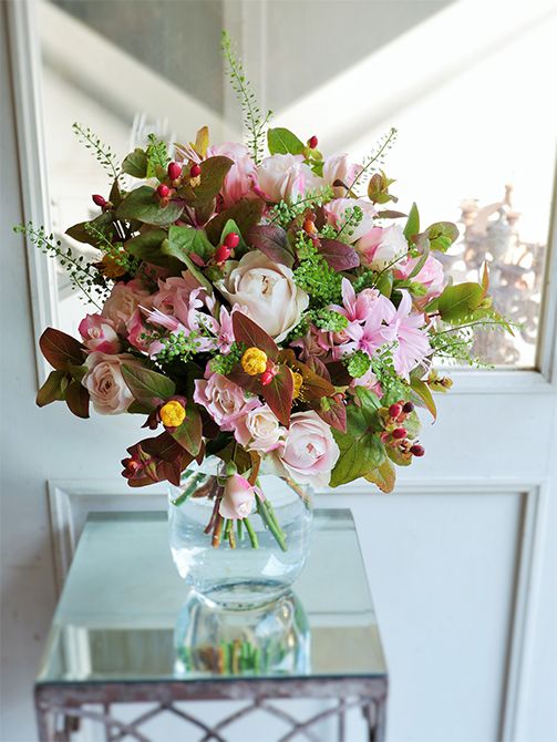 奥さまの誕生日にご主人から贈り花を。バラ‘シフォンベール’と‘ストロベリーモンローウォーク’にダイヤモンドリリー。淡いピンク系の中に、赤い実と黄色の花がついた紅葉ヒペリカム‘マジカルスカーレット’をたっぷり加えると、大人っぽい雰囲気に。タラスピオファリムなどフレッシュグリーンをあしらって。記事を読む>>