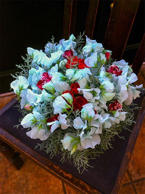 宮崎県日南市「太陽農園」の染めのスイートピー‘ミント’は白にうっすらミントブルーを帯びる花色がとても素敵。その‘ミント’をたっぷり使い、2種の赤バラ、‘マスカレード’と‘フリューレット’をアクセントに加え、コニファー‘ブルーアイス’をあしらったアレンジです。珍しい染めのスイートピーが贈るお相手のハートをつかむと思います。
