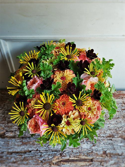 花弁が多く密度感のあるジニアやバラのアレンジに、ルドベキア‘ヘンリーアイラーズ’を加えると、ストロー状の花弁がすき間をとって並び着くさまがよく目立ち、アクセントになってくれます。引き締め役にチョコレートコスモスを散らし、グリーンワッフルゼラニウムでナチュラル感をプラスしました。