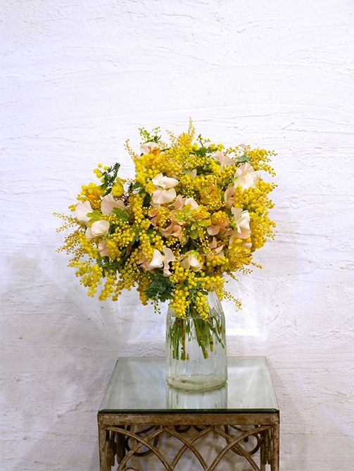 リビングに飾るブーケのオーダーをいただき、金葉(きんよう)アカシア‘ツトム’とアカシア‘さきがけ’をたっぷり使い、アクセントにスイートピー‘めぐみ’を加えたシンプルなブーケを制作。この作品をSNSにアップしたことがきっかけで、‘ツトム’を生産する「國司グリーン」さんと、‘さきがけ’の生産者「株式会社伴右衛門」さんの交流が始まり、お二人でアカシア談義をされているそうです。