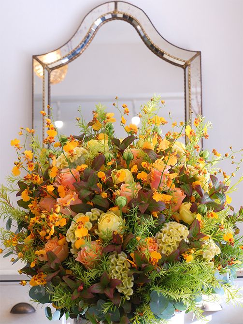 2種のバラとケイトウのアレンジ。飛び出すように挿したオンシジウムは‘オレンジスイート’という品種です。鮮やかなオレンジ色にえんじ色のリップが入り、よく目立ちます。バラは‘カルペディエム’と蕾つきの‘カタリナ’。ケイトウは‘アスカセレクト ベージュ’を使用。メラレウカや紅葉ヒペリカムを加えて、秋の雰囲気に仕上げました。