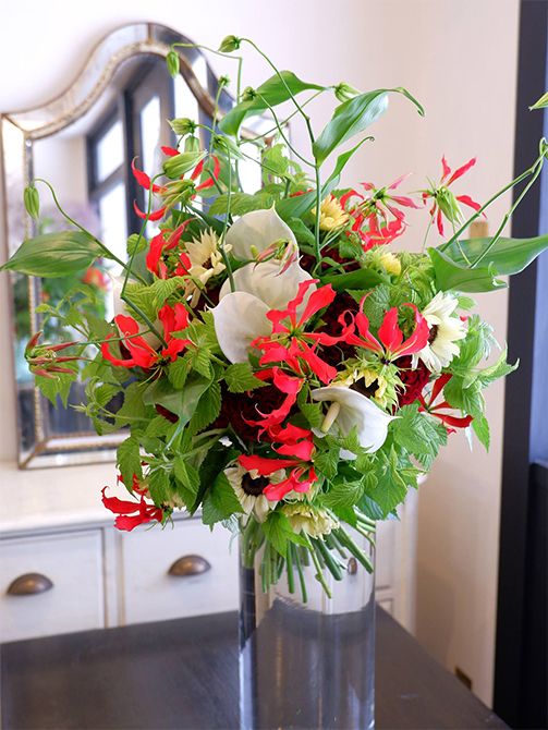 メキシコ料理店に周年記念の贈り花を、というオーダーをいただき、これは情熱的な朱赤のグロリオサをぜひ使いたいと思いました。おなじみの朱赤でも花が小ぶりなミニグロリオサの‘マスコット レッド’を選び、アンスリウム‘ウィスパー’やヒマワリ‘ホワイトナイト’、ケイトウ‘アスカセレクト レッド’を合わせました。フランボワーズやキイチゴ‘ベビーハンズ’をたっぷり加えてナチュラルな仕上がりに。