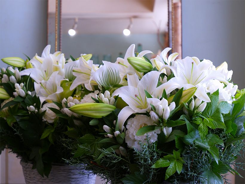ユリ‘カサブランカ’を主役に、白い花を集めたアレンジをお揃いで制作しました。白い花はリンドウ‘ホワイトベル’、リシアンサス‘ボンボヤージュ シルク’、パフィオペディルム‘クレアドルーン’。キイチゴ‘ベビーハンズ‘、コニファー‘ブルーアイス’をあしらい、清涼感のある贈り花に。