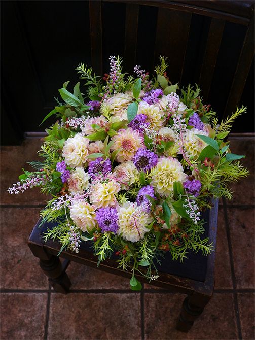 お誕生日のお祝いに透明感あふれる秋の贈り花を。淡いクリーム色にピンクが入るかわいらしいダリア‘キャンキャン’と、よく似た花色のカーネーション‘レディシーン’を合わせ、スカビオサ‘ビオレ’、紅葉ヒペリカム、ヨウシュヤマゴボウ、メラレウカ‘レボリションゴールド’などを加えたアレンジです。