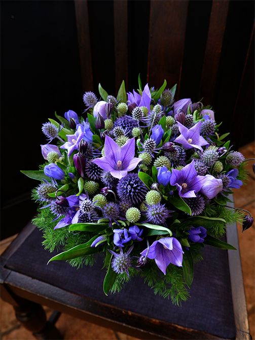 キキョウ、リンドウ‘プチブルー’、ルリタマアザミ‘ベッチーズブルー’、エリンジウム、クレマチス‘篭口’など、真夏のブルーを集めたアレンジを、喜寿(77歳)を迎える男性のお祝いに。ニュアンスの異なる美しいブルーに。制作している私自身も魅了されました。