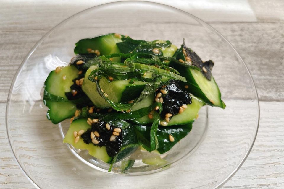 1)乱切りしたきゅうり、わかめ、千切りのしそをボウルに入れる。