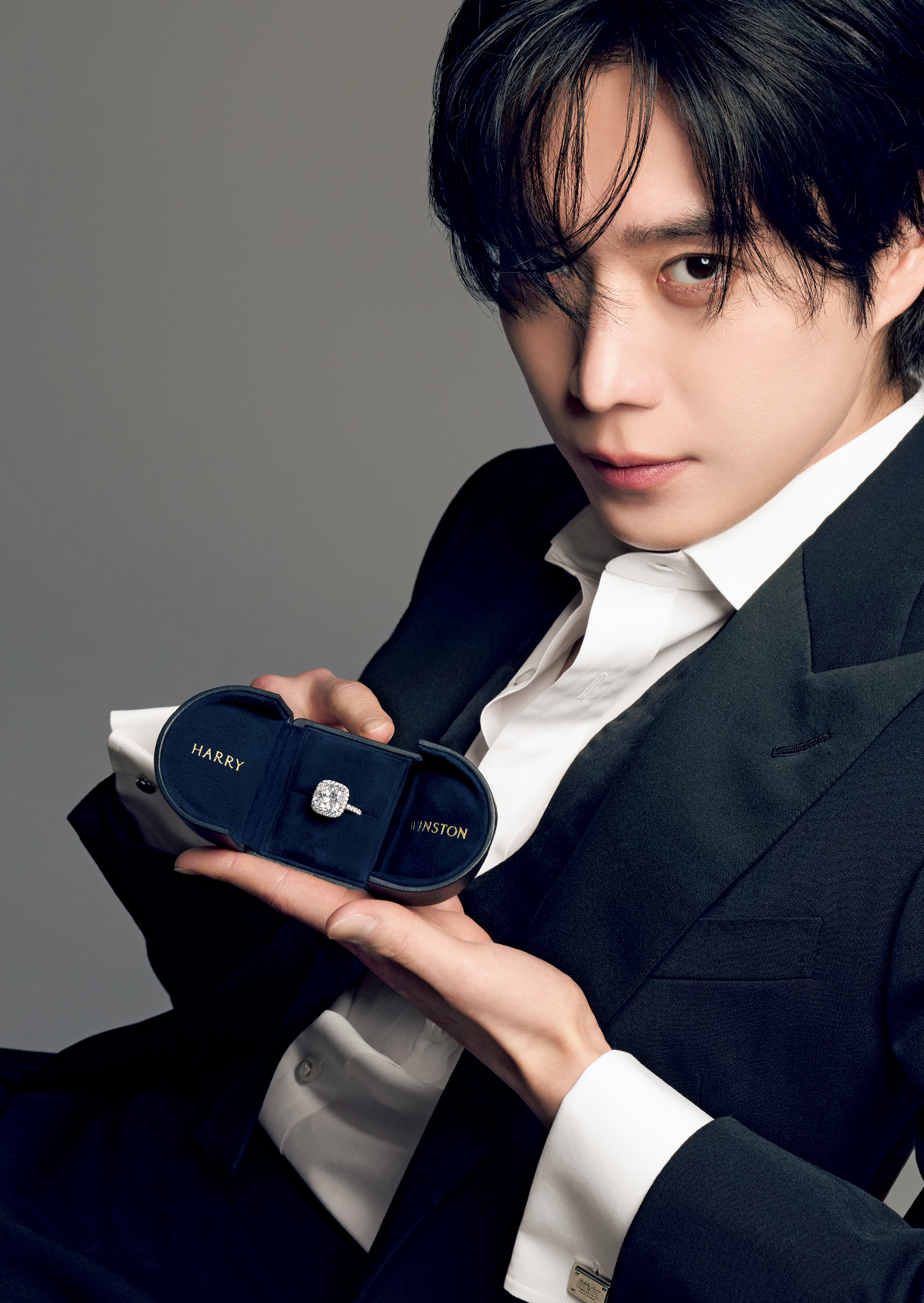 プレゼントという設定の演出に「いつの日か結婚したら、お相手に贈りたいですね。“永遠に輝く美”に魅了されました」。「クッションカット・マイクロパヴェ・リング」(Pt×ダイヤモンド・センター約6.51ct)1億2045万円(参考価格)/ハリー・ウィンストン(ハリー・ウィンストン クライアントインフォメーション) ボウタイ3万6300円 ジャケット パンツ シャツ カフス(すべて参考商品)/すべてラルフ ローレン パープル レーベル(ラルフ ローレン)