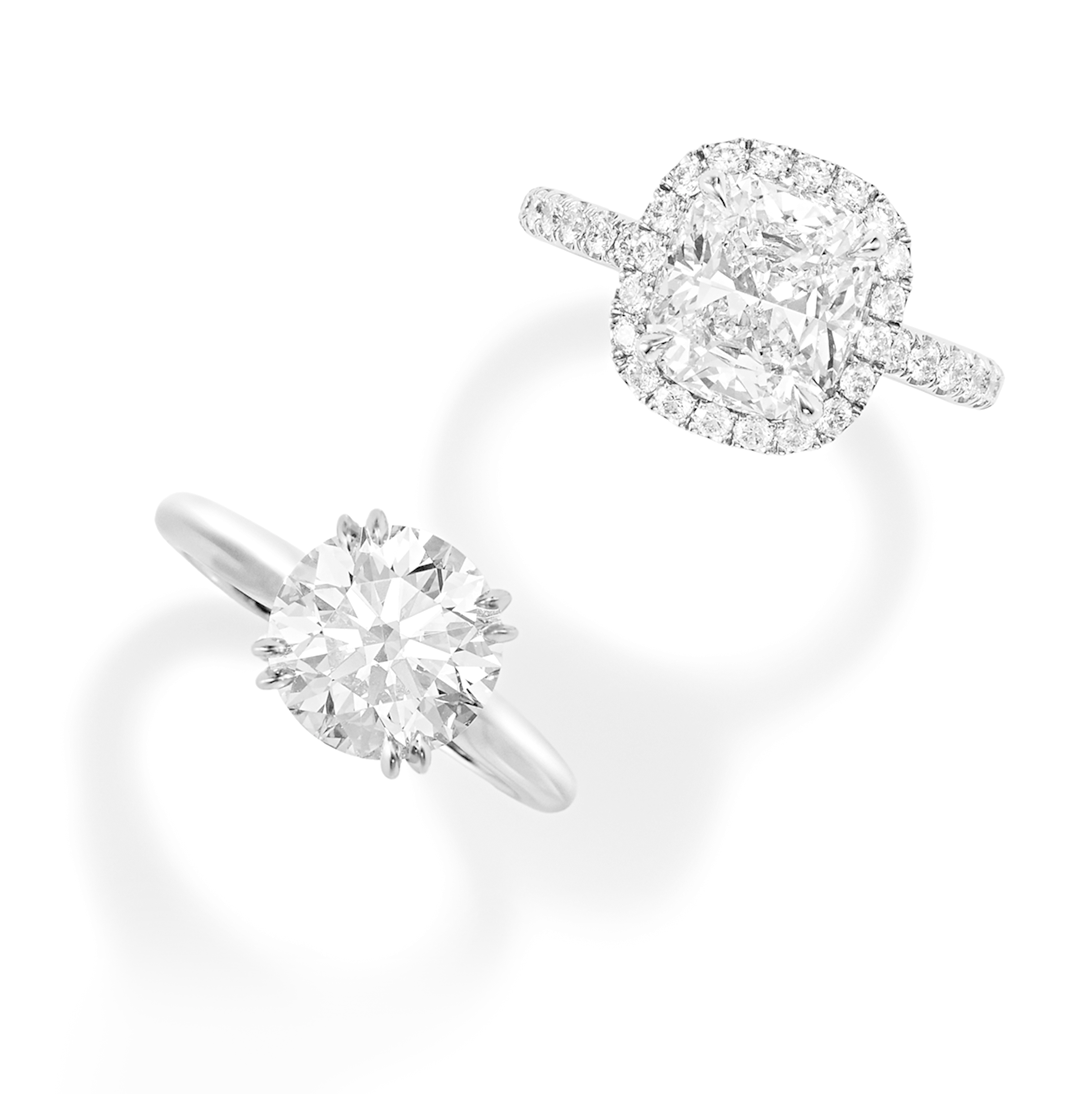 〈上写真・左〉「キング・オブ・ダイヤモンド」が誇る職人のカット技術だからこそ引き出せる、ダイヤモンドの理想的な輝きがここに。「ラウンドカット・ソリティア・リング」(Pt×ダイヤモンド・センター約3.02ct)3047万円/ハリー・ウィンストン(ハリー・ウィンストン クライアントインフォメーション)