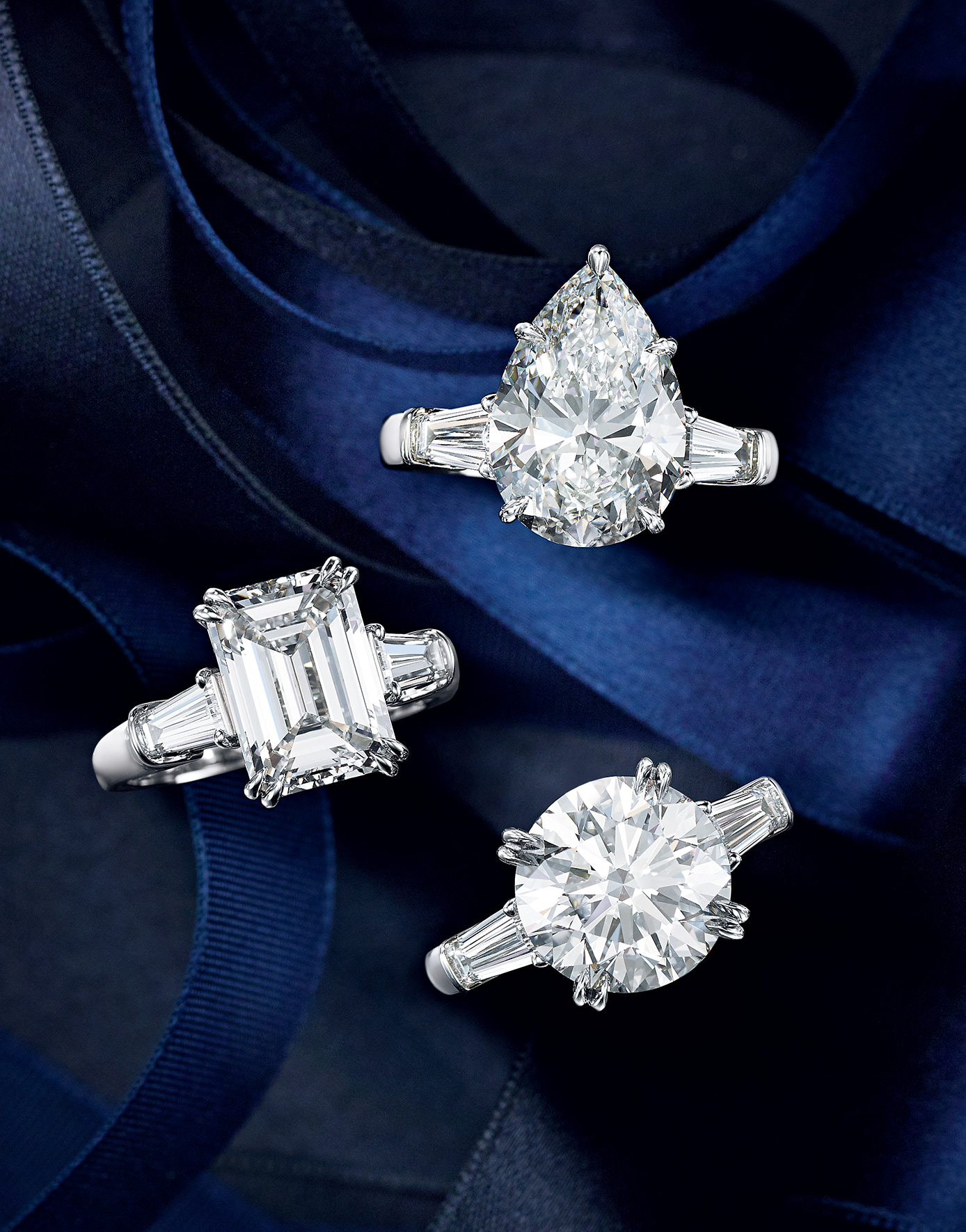 さまざまな手法でダイヤモンドに命を吹き込む熟練の技に、ブランドのレガシーが宿る。上から・「ペアシェイプ・クラシック・リング」(Pt×ダイヤモンド・センター約5.25ct)7304万円 「エメラルドカット・クラシック・リング」(Pt×ダイヤモンド・センター約4.22ct)4532万円 「ラウンドカット・クラシック・リング」(Pt×ダイヤモンド・センター約5.02ct)8723万円/すべてハリー・ウィンストン(ハリー・ウィンストン クライアントインフォメーション)