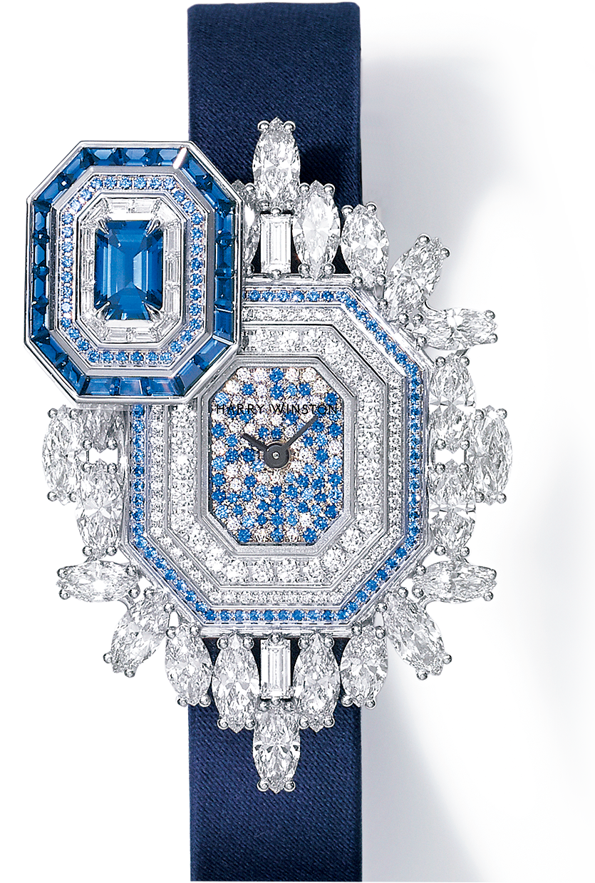 圧倒的な宝飾性で唯一無二の存在感を誇るハイジュエリー・タイムピース・コレクション。ブルーサファイアがあしらわれたモデルも。「アルティメイト・エメラルド・シグネチャー」(WG×ダイヤモンド×ブルーサファイア、クォーツ、ケース縦46×横32ミリ、サテンストラップ)1952万5000円/ハリー・ウィンストン(ハリー・ウィンストン クライアントインフォメーション)
