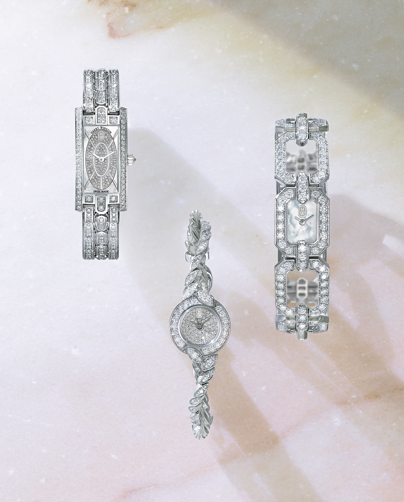 ハイジュエリー・タイムピースのデザインにも生かされた、ハリー・ウィンストンならではの卓越した芸術性。時を超え、時を刻み続けて。右・「ダイヤモンド・リンクス・バイ・ハリー・ウィンストン」(Pt×ダイヤモンド×マザーオブパール、クォーツ、ケース縦20.4×横16.5ミリ)1784万2000円 中・「ミニツイスト・バイ・ハリー・ウィンストン」(WG×ダイヤモンド、クォーツ、ケース径18.5ミリ)778万8000円 左・「HW アヴェニューCミニ・エリプティック」(WG×ダイヤモンド×マザーオブパール、クォーツ、ケース縦32.3×横15.6ミリ)907万5000円/すべてハリー・ウィンストン(ハリー・ウィンストン クライアントインフォメーション)