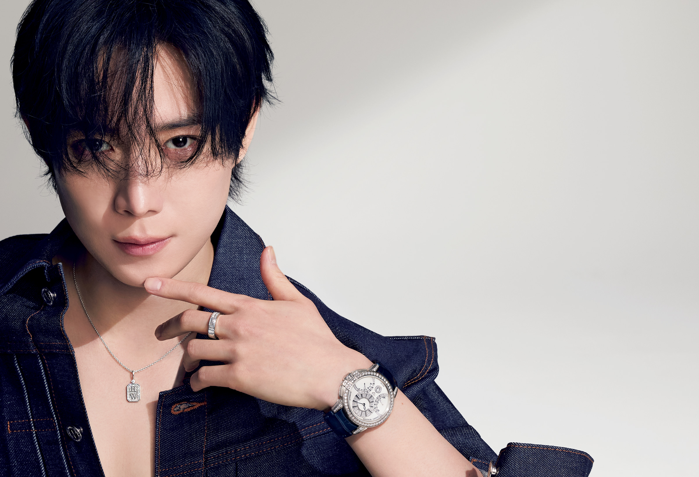 〈上写真〉時計好きのヨンデさん曰く、「あらゆるシーンやスタイルに格を添える存在感に魅了されました」。時計「HW オーシャン・バイレトログラード オートマティック 42㎜」(WG×ダイヤモンド×マザーオブパール、機械式自動巻き、ケース径42.2ミリ)1195万7000円 チャーム「HWロゴ・チャーム」(Pt×ダイヤモンド計約0.29ct)123万2000円 「ペンダントチェーン」(Pt)39万6000円 リング「トラフィック・アクセント・バンドリング」(Pt×ダイヤモンド計約0.42ct)141万9000円~/すべてハリー・ウィンストン(ハリー・ウィンストン クライアントインフォメーション) デニムジャケット/スタイリスト私物