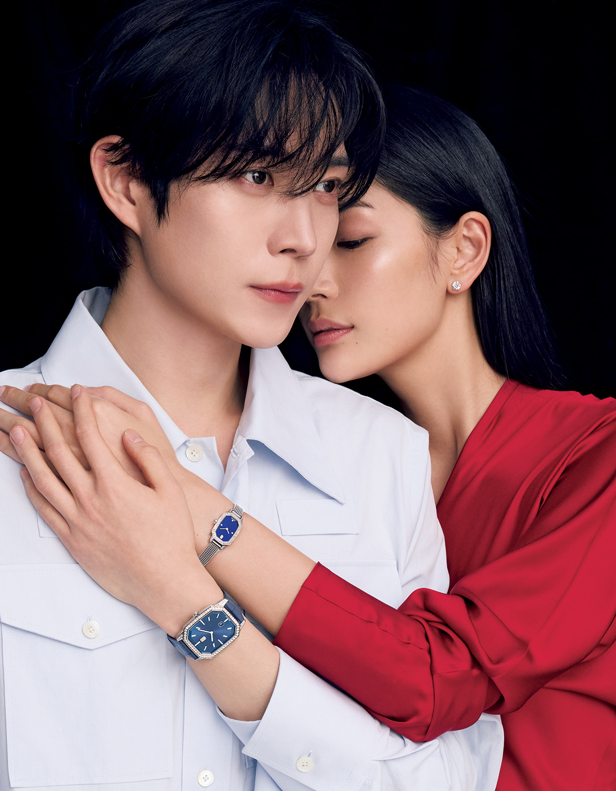 ヨンデさん曰く、「深いブルーが印象的。好みの時計に出合えました。カップルで一緒につけても、上品で素敵ですね」。時計〈ヨンデさん〉「HW エメラルド 33㎜」(WG×ダイヤモンド、クォーツ、ケース縦39.3×横33.3ミリ)360万8000円 〈大塚さん〉「HW エメラルド」(WG×ダイヤモンド、クォーツ、ケース縦24×横17.7ミリ)360万8000円~ 「ラウンドカット・イヤスタッズ」(Pt×ダイヤモンド各約1.2ct)1080万2000円/すべてハリー・ウィンストン(ハリー・ウィンストン クライアントインフォメーション) 〈ヨンデさん〉シャツ15万5100円 〈大塚さん〉ドレス55万3300円/ともにランバン(コロネット)