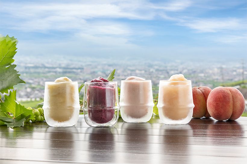 農園内の「やまきやカフェ」テラス席にて。眼下に肥沃な甲府盆地が広がる。“飲むかき氷”として親しまれる名物のスムージーは、果実本来の優しく滋味溢れる味わいが人気。左からシャインマスカット、ブルーベリー、いちご、桃。各650円。