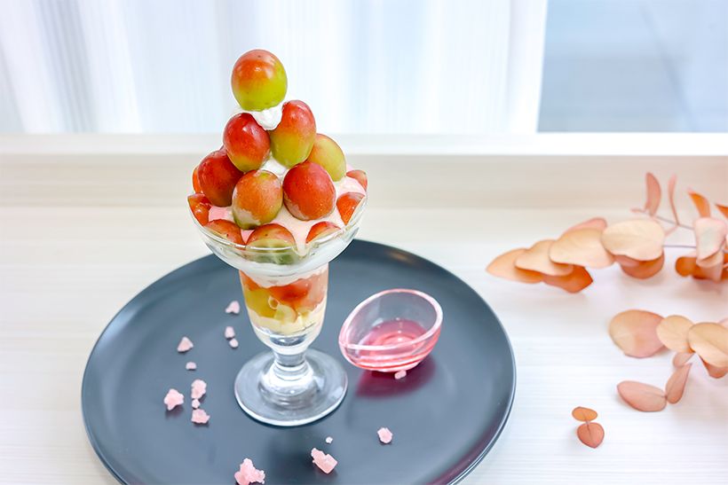 山梨県オリジナル品種のぶどうを使った「サンシャインレッドのグラデーションパフェ」が2024年から登場。皮ごと食べられる赤系のぶどうで、華やかな香りが特徴です。2500円~(価格はその年の収穫状況によって変動)、8月中旬以降提供予定。