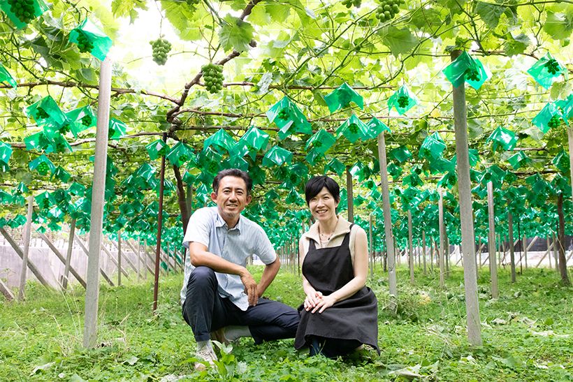 古谷 崇さんと妻の朋美さん。畑には約15本のぶどうの木が枝を広げて、シャインマスカットがどんどん成長しており、年間1万5000房ほど収穫できるそう。