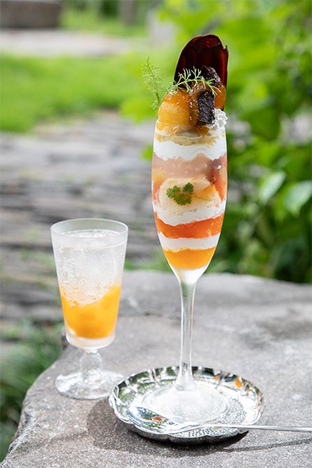 初夏限定の「梅のパフェ 梅スパークリングドリンク付き」2680円(6月で終了)。梅、ぶどう、さくらんぼなど、柑橘以外はほとんど山梨県産の素材を使用。8月からは一番人気の「シャインマスカットのパフェ」が登場。