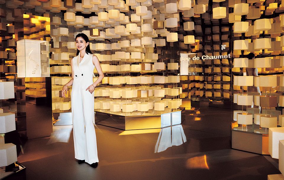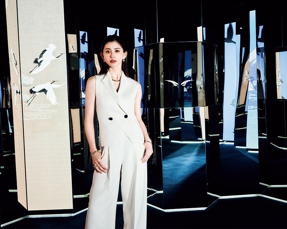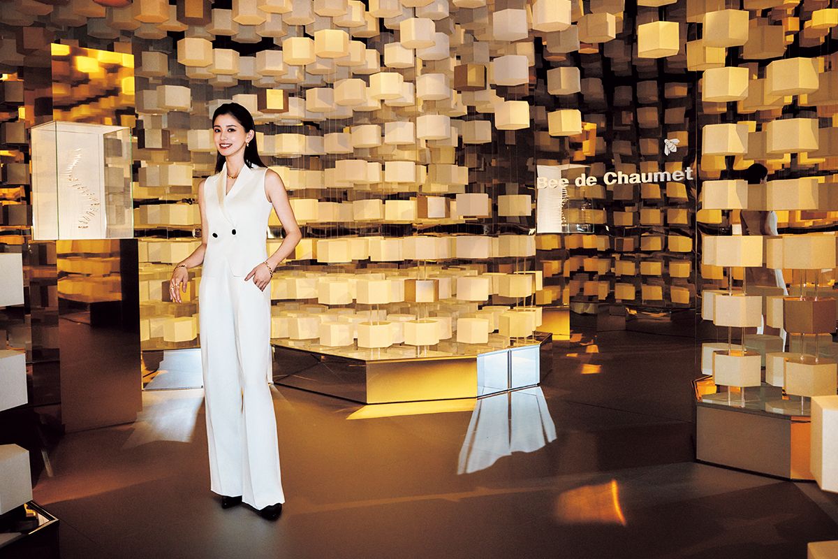 〔「ビー ドゥ ショーメ」の華麗なる世界に浸る〕ミツバチの巣に入り込んだような空間に、「ビー ドゥ ショーメ」コレクションのハイジュエリーから新作までを展示。「ビー ドゥ ショーメ」ピアス333万1000円 同ネックレス992万2000円(参考価格) 右手・同ブレスレット手先から87万100円 195万8000円 同リング〈人差し指〉157万3000円~ 〈薬指〉194万7000円 左手・同ブレスレット690万8000円 同リング指先から16万6100円 47万6300円 45万1000円/すべてショーメ ベスト35万2000円 パンツ41万8000円 靴19万5800円/すべてジョルジオ アルマーニ(ジョルジオ アルマーニジャパン)