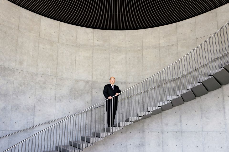 「大阪市立東洋陶磁美術館」。リニューアルされたエントランス。曲面のコンクリート壁に沿うよう階段を設置。上った先に展示スペースがある。