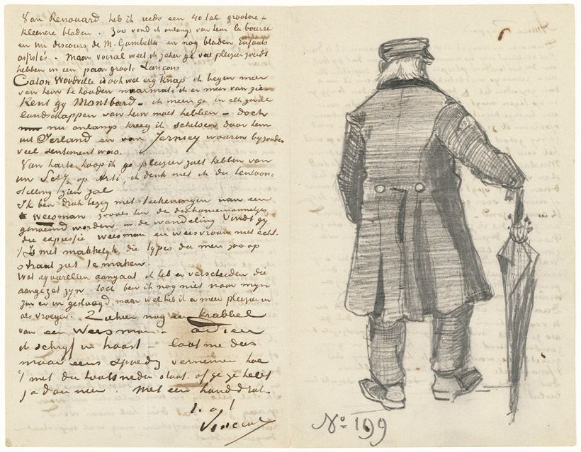 「傘を持つ老人の後ろ姿が描かれたアントン・ファン・ラッパルト宛ての手紙」① 1882年9月23日頃 ファン・ゴッホ美術館、アムステルダム(フィンセント・ファン・ゴッホ財団)