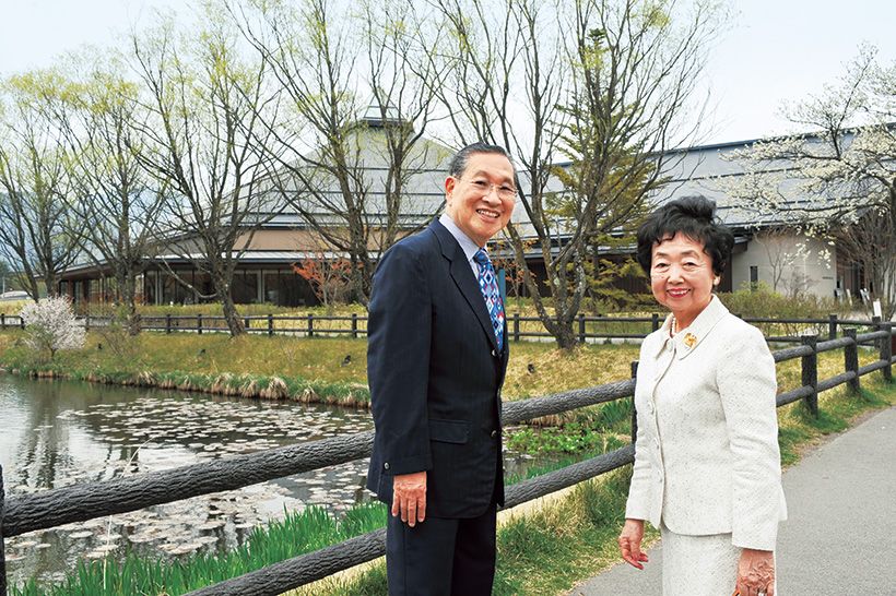 軽井沢大賀ホールの前で笑顔を見せる故・大賀典雄さん(左)と緑さん。ホールの候補地は3か所あったが、典雄さんは、矢ケ崎池、離山と浅間山と緑に囲まれたこの場所に一目で決めたという。©E.Miyoshi