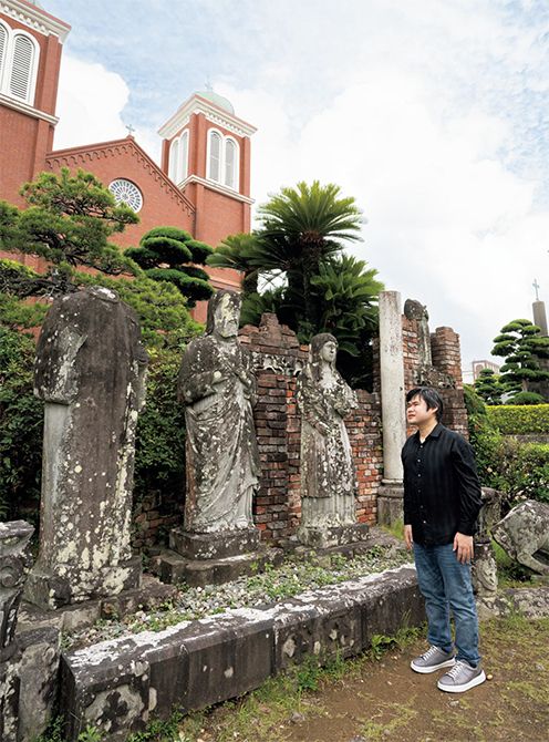 旧浦上天主堂の遺構に立つ首のない聖人像の前で、想いを馳せる辻井さん。