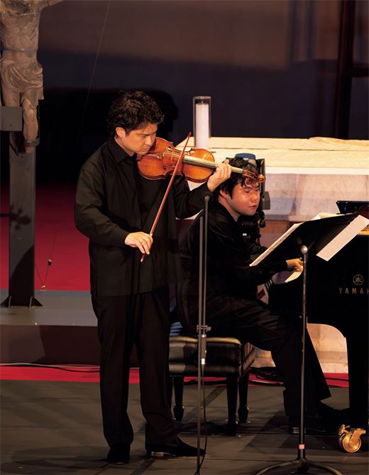 ヴァイオリニストの三浦文彰さんとブラームス「ヴァイオリン・ソナタ第1番《雨の歌》」を演奏する辻󠄀井さん。聴き入る約630人の長崎県民のなかにはノーベル平和賞を受賞した日本被団協の方をはじめ被爆者団体の方々も。