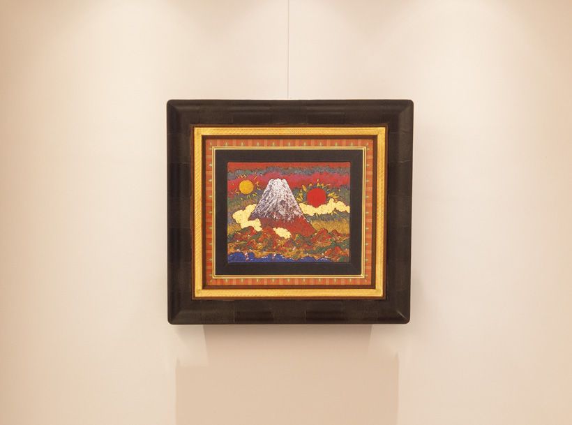 「信仰の対象と芸術の源泉」として自然遺産ではなく、世界文化遺産に登録された富士山。「芸術の源泉」として、古より現代まで、脈々と芸術的創造力を与え続けている。写真は、兵庫県芦屋市在住の会社経営者が飾っている文化勲章受章者、絹谷幸二画伯の作品「新世紀日月富士」。「会社経営をしていると、見ると活力が生まれ、元気になる作品が必要です」。