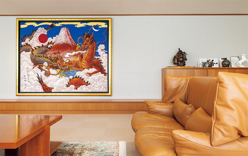 ビジネス風水の世界では、山岳の絵画や写真を飾ると運気が上がるとされるが、その中でも富士山は別格。上写真・左の絵画は、文化勲章受章者、絹谷幸二画伯が、富士山が2013年に世界遺産に登録された際に描いた「祝 玉取り双龍不二山(あうん)」。181.1×227.3センチと絹谷富士の中でも最大規模の大作。関西の会社経営者の社長室にて。