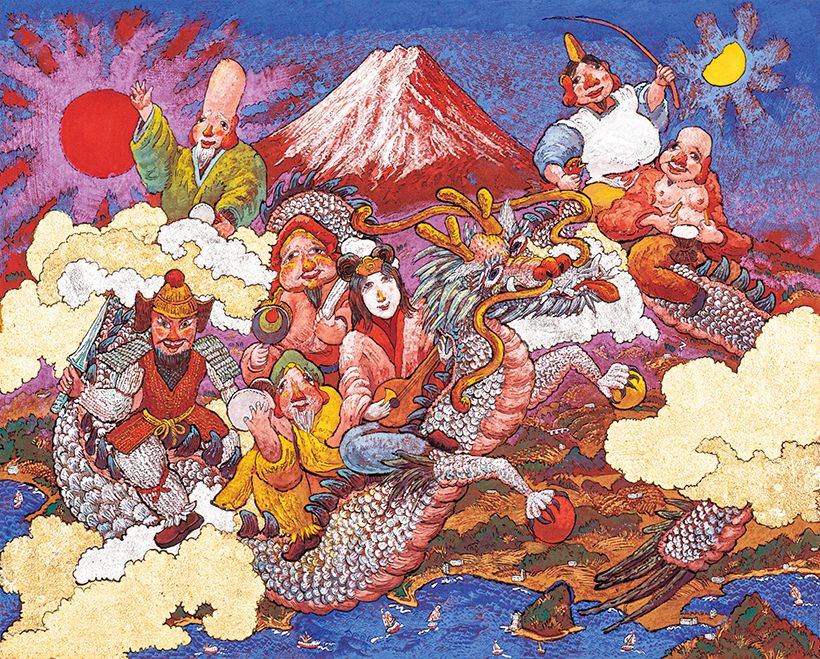 富士山と龍という伝統的なモチーフに、日本人になじみ深い「七福神」のユニークな姿を加えた作品。