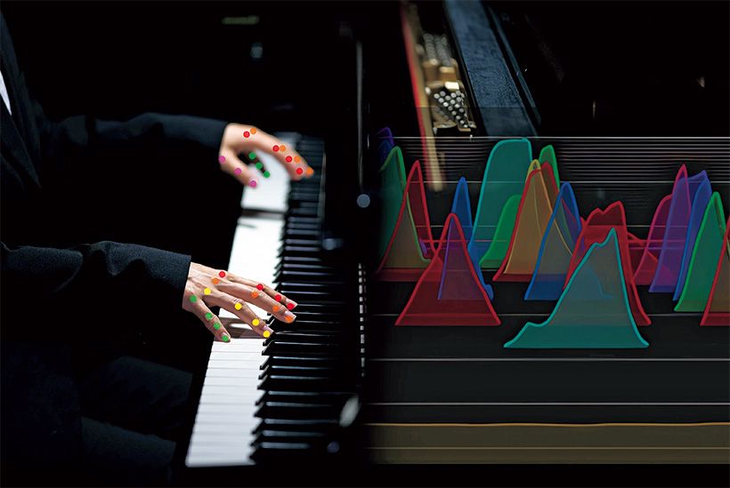 88鍵すべての鍵盤の下にセンサーを入れて、指がタッチする1秒間の動きを1000コマの精度で分析。