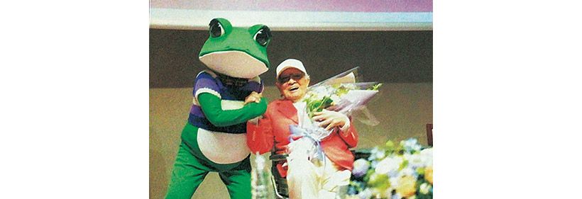 100歳のバースデートークショーには、ケロヨンもお祝いに駆けつけた。