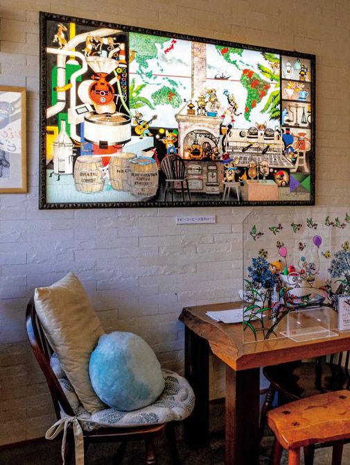 藤城さん専用の席。壁に飾られているのは《ラビーコーヒー人生のルーツ》。