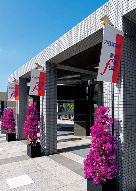 音楽祭のフラッグが掲げられ、南国宮崎らしいブーゲンビリアが華を添えるエントランス。©K.Miura