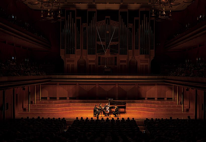 音楽祭創設時に尽力した世界的音楽家の名を冠した、アイザックスターンホール。ウィーンのムジークフェライン「黄金の間」をモデルにした豊かな響き、華やかさと温かみが魅力。ヴァイオリン:三浦文彰、ピアノ:辻󠄀井伸行、ヴィオラ:鈴木康浩、チェロ:ヨナタン・ローゼマンによる室内楽コンサート(2025年5月3日)。