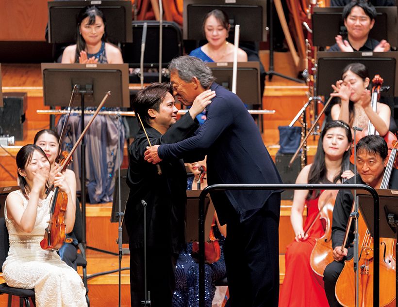 世界的指揮者チョン・ミョンフン氏を迎え、音楽祭のための特別編成オーケストラ、宮崎国際音楽祭管弦楽団とともにステージに立つ三浦さん。アイザックスターンホールにて。©K.Miura