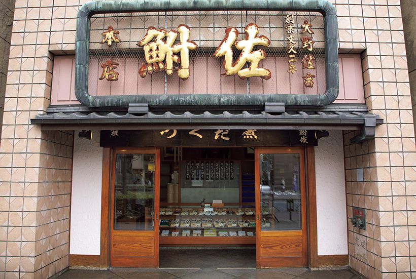 江戸前佃煮の元祖初代大野佐吉が釣りで時化に遭い、避難した佃島で漁師が作る雑魚の塩煮に感銘を受け、醬油を使った佃煮を考案したのが創業のきっかけ。「ヤマサ」の特選醬油を用いた秘伝のたれを使い、薪の火で魚介を一気に煮上げます。主人自らが釜の前に立ち、一子相伝の製法で160年以上、変わらぬ味を守り続けています。