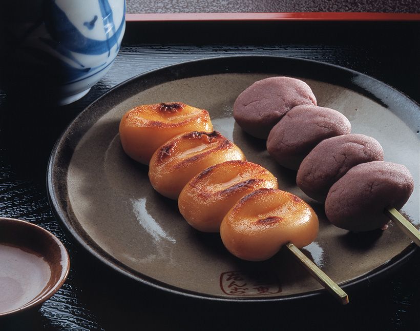 うるち米製の平たい団子は生醬油の「焼き団子」と渋抜きした餡の「餡団子」各1本330円。写真/小林庸浩